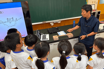 次世代を担う子どもたちに建設の仕事を身近に感じてもらうため、橋やトンネル、地層、川、ダムなどをテーマに出前講座を実施しています。