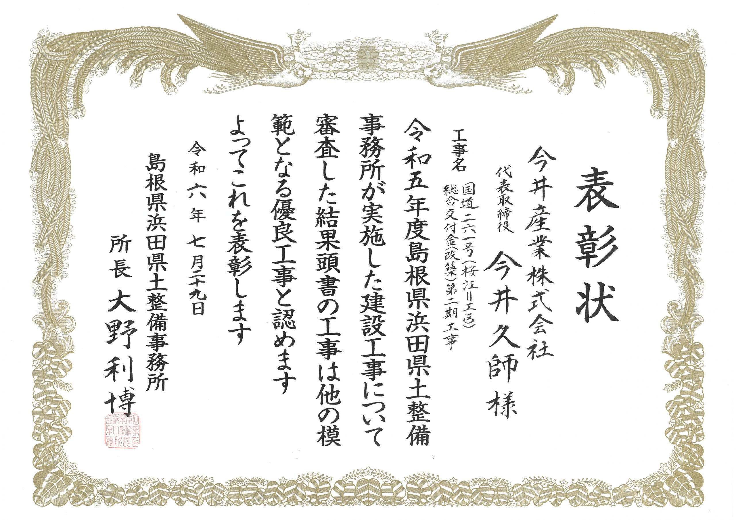 この度(令和6年7月29日)、当社が施工した「国道261号桜江Ⅱ工区総合交付金改築第二期工事」が島根県浜田県土整備事務所より優良工事表彰を受けました。