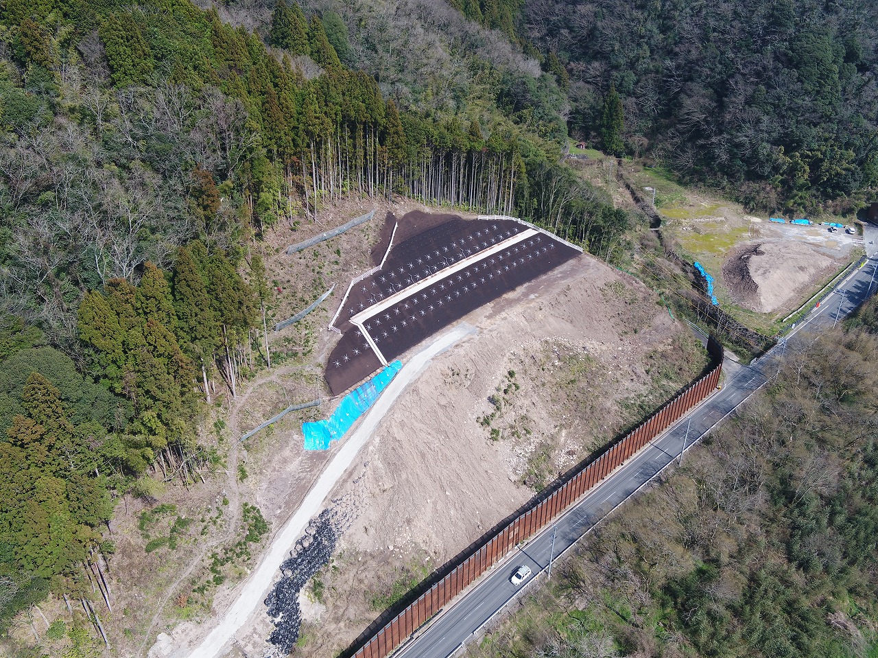「国道261号桜江Ⅱ工区総合交付金改築第二期工事」は江の川沿線において、生活上の幹線道路としても重要な役割を担っている国道261号のアクセス利便性の向上を図ることを目的とした整備事業の一環とし、軟弱地盤対策工事(法面工事)を行いました。土留防護柵による長期交通規制を解消するなど仮設計画の工夫をおこないました。